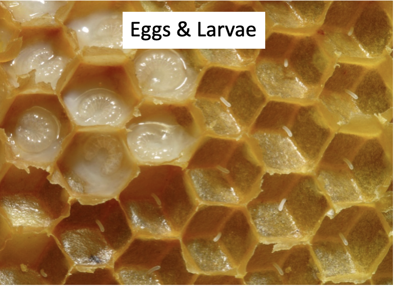 Young larvae eat their way through the royal jelly in a circular pattern until they become crowded, then they stretch out lengthwise in the cell. Soon they begin to spin a cocoon, and their older sisters cap the cell as they go into the pupa stage. These cells collectively are called "capped brood."