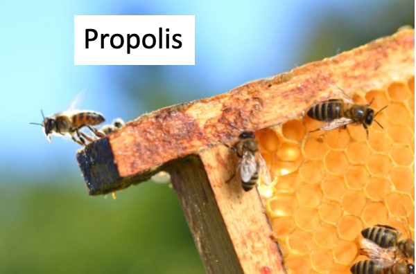 Propolis or bee glue is a resinous mixture that honey bees produce by mixing saliva and beeswax with exudate gathered from tree buds, sap flows, or other botanical sources. It is used as a sealant for unwanted open spaces in the beehive.