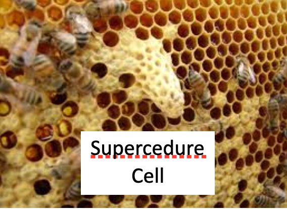 When a colony is raising a new queen to replace the aging, ill or missing queen, they produce supersedure cells. The new queen that emerges from the cell will take over from, or supersede, the old queen. Typically found towards the top of the frame.